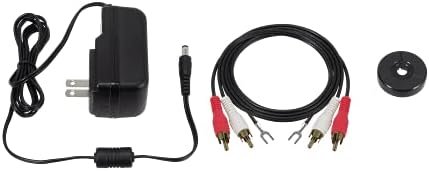 Includes: USB cable, detachable RCA output cable (dual RCA male to dual RCA male), AC adapter, 45 RPM adapter, counterweight, felt mat, and removable hinged dust cover