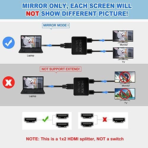 4K ULTRA HD RESOLUTION – HDMI Splitter for dual monitor support 4K, 3840x2160p, 3D, and 480i@60Hz/ 480p@60Hz/ 576i@50Hz/ 576p@50Hz/ 720p@50/ 60Hz/ 1080i@50/60Hz/ 1080p@50/60Hz/ 1080P 24Hz 3D/720 60Hz /4K@30HZ [For 4K resolution, the frequency can’t above 30Hz].NOTE:Not Compatible With HDCP2.2