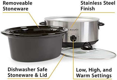 This Crock-Pot 7-Quart Oval Manual Slow Cooker provides you the flexibility to prepare a meal early, and then have it slow-cook all day. You can carry out your full day’s activities and still enjoy a nutritious, home-cooked meal in the evening. The 8-quart extra-large capacity is also perfect for larger families or entertaining; It’s a healthier, more cost-efficient and convenient way to serve tasty, satisfying meals. This Crock-Pot Manual Slow Cooker cooks on high or low settings and the WARM setting can be used to keep your dish at an ideal serving temperature.Stainless steel exterior with black accents and plastic handles.
