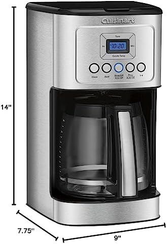 Turn up the flavor and the temperature on your coffee with the Cuisinart 14 Cup Programmable Coffeemaker! Using our cutting edge coffee technology, the 14 Cup Programmable Coffeemaker can give you hotter coffee without sacrificing taste. Choose a regular or bold flavor profile and set the brew-time up to 24 hours ahead so your next cup is ready when you are. The backlit LCD is easy-to-read, a ready tone can be turned on or off, and an indicator light signals when it’s time to decalcify. Refer to the user manual for troubleshooting steps. Features: Hotter Coffee with expert coffee-making technology to ensure hotter coffee temperature without sacrificing flavor or quality|Brew Strength Control allows you to select Regular or Bold coffee flavor|Fully Automatic with 24 hour programmability self clean 1–4 cup setting auto-off (0–4 hours) and optional ready alert tone|14 Cup Glass Carafe with decorative stainless steel handle|Easy-to-View Water Window for accurate filling Brew Pause™ feature lets you enjoy a cup of coffee before the brewing cycle has finished 60-Second Reset recalls settings and position in the brewing process in case of loss of power|Gold-Tone Coffee Filter and Charcoal Water Filter|Limited 3-Year Warranty.