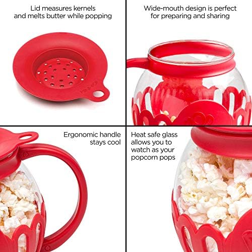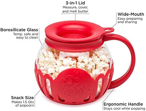 Ecolution Original Microwave Micro-Pop Popcorn Popper, Borosilicate Glass, 3-in-1 Silicone Lid, Dishwasher Safe, BPA Free, 1.5 Quart – Snack Size, Red.