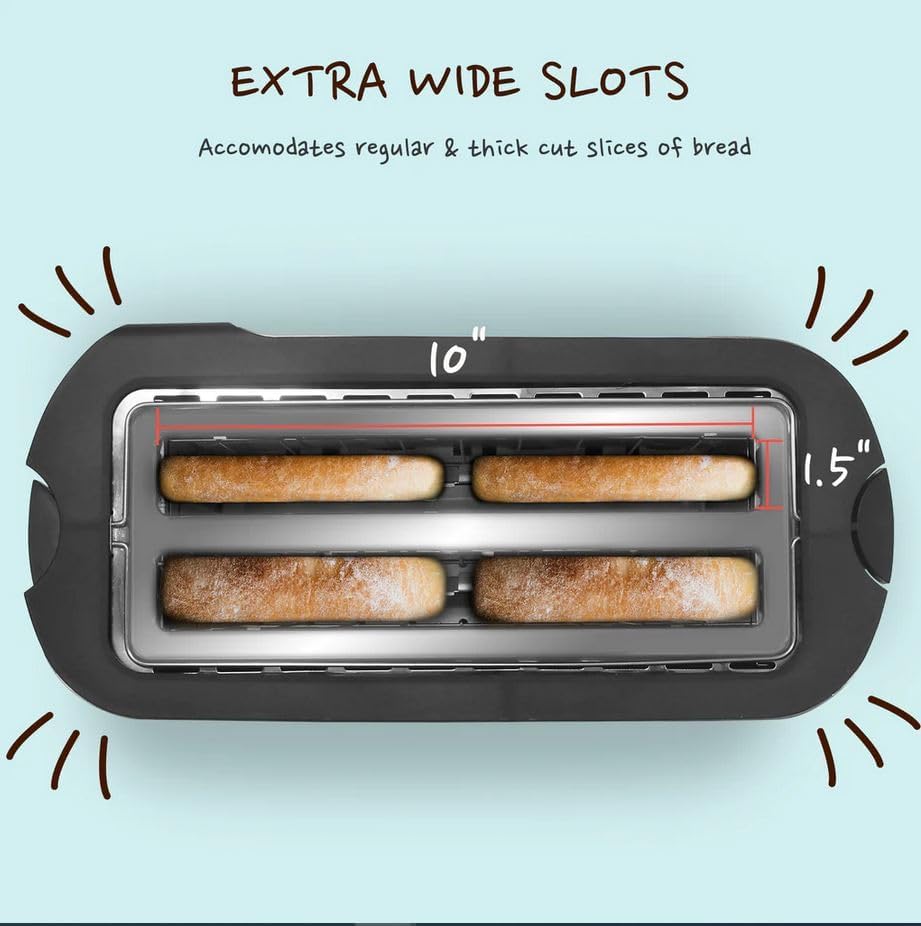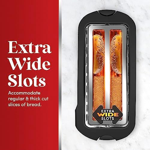 EXTRA WIDE TOASTING SLOTS to fit extra thick slices of bread products such as Texas Toast, bagels and specialty breads.