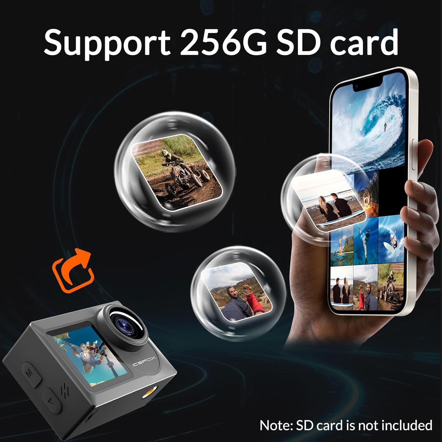 【Rich Accessories & Easy Installation】-Accessories Include icefox action camera, 2 x batteries, bicycle mount, 360° rotating screw, release buckles, and more. This action camera comes with all essential accessories for quick, easy setup. Its versatile mounts let you attach it to your bike, helmet, or other gear.