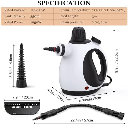 🌱Powerful Boiler: Steamer cleaning heats up quickly in 3 minutes and emits 221°F pressurized powerful hot steam. 1050W power, 350ML water tank capacity (250ML water capacity is recommended to leave some space for normal use), continuous running time of 10 minutes or more.