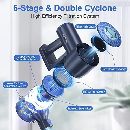 🏘️【6 STAGE DOUBLE-CYCLONE FILTRATION】: Vacuum cleaner stick’s breakthrough 6-Stage Double-Cyclone Filtration System ensures that 99.98% of microscopic dust particles as small as 0.1 microns are filtered out, providing you and your family with fresh air. Stick vacuum cleaner cordless upgraded Double Cyclone Filter provides Powerful Suction + Secondary Refiltration so that no dust can escape upright vacuum cleaner and your notice.