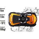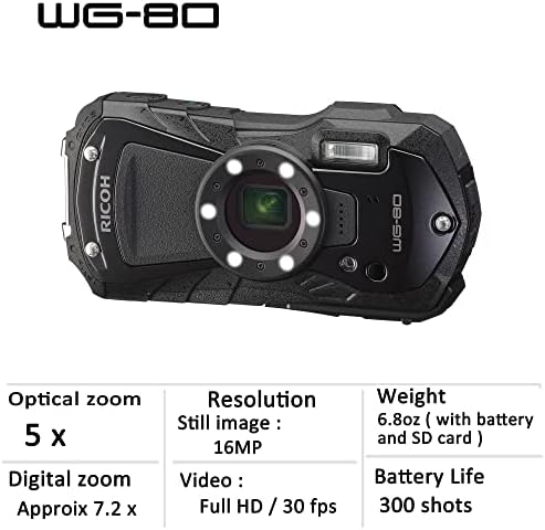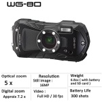 ” 1. Heavy-duty construction assuring underwater shooting down to 14 meters, for up to two hours The solid, airtight body common to the WG-80 is not only waterproof down to a depth of 14 meters for up to two hours of continuous operation (equivalent to IPX 8 or JIS Class 8), but is also shockproof against falls from a height of 1.6 meters,* dustproof (equivalent to IPX 6 or JIS Class 6), freeze-proof to temperatures as low as -10°C, and crushproof against weights up to 100kgf (kilogram force). ** Thanks to this heavy-duty construction, the cameras perform superbly and dependably even in harsh, demanding outdoor conditions. * Measured under RICOH IMAGING-original testing standards — from a height of 1.6 meters, onto a surface of 5cm-thick plywood — conforming to Method 516.5-Shock of the MIL-Standard 810F. ** Measured under RICOH IMAGING-original testing standards. 2. Exceptional image quality The WG-80 comes equipped with a back-illuminated CMOS image sensor, which assures excellent high-sensitivity and low-noise characteristics and high-speed readout of image data signals. Coupled with a high-performance imaging engine, this image sensor delivers a top sensitivity of ISO 6400 and super-high-resolution images with approximately 16.0 effective megapixels. These models also provide advanced image processing functions, made possible by the latest super-resolution technology, to assure sharp, clear, high-resolution images. They even offer such innovative features as Handheld Night Snap mode, which automatically captures several images of the same nighttime scene and produces a single, blur-free composite image from them. 3. Six Macro Lights to assist close-up shooting, with various functions Ideally positioned around the circumference of the lens barrel for macro shooting, six LED Macro Lights allow the WG-80 to provide bright, uniform illumination on a subject when the Digital Microscope mode is selected. Providing the maximum illumination intensity almost twice that of its predecessor and a five-step intensity adjustment function, this six-light unit enables the photographer to effortlessly optimize the close-range flash photography based on the subject or creative intention. In order to minimize camera shake and subject shake, the Instant Illumination Enhance function allows for the use of a higher shutter speed by automatically raising the discharge level of the Macro Lights at the moment of shutter release. The Macro Lights also provide other useful functions, such as a Self-Portrait Assist mode, which uses the blink of an LED lamp to check if the subject’s face has been safely captured within the picture frame, and the LED Lighting mode, which uses the Macro Lights as a lighting device in the dark. 4. Underwater shooting mode Specifically designed for underwater photography, the Underwater and Underwater Movie shooting modes are programmed to optimize color and contrast, based on the data of images actually captured under the water. These modes deliver sharp, true-to-life images by enhancing shades of red which are lost in underwater photography, while effectively compensating for the loss of contrast caused by the diffusion of light in water. In the Underwater mode, the Flash Off + Flash On option allows the user to consecutively capture two images with a single shutter release — one without flash and another with flash. 3 5. 5X optical zoom lens with a 28mm wide-angle coverage The WG-80 feature a high-performance, five-times optical zoom lens with a focal-length coverage from 5mm to 25mm (equivalent to approx. 28mm to 140mm in the 35mm format) to accommodate a wide range of scenes and subjects, including sweeping landscapes. They also provide other convenient shooting functions, such as a macro mode to capture dramatic close-up images from a minimum focusing distance of a mere one centimeter; an Intelligent Zoom function to extend the zoom range to approximately 36 times (equivalent to 1008mm in the 35mm format) without compromising image quality, for superior telephoto photography; and an interval shooting mode, which comes in handy for fixed-point observation. 6. Full HD movie recording for extended shooting of high-quality movies The WG-80 provides Full HD movie recording employing the H.264 recording format. Users can capture high-quality, extended movie clips (1920 x 1080 pixels, 16:9 proportions) at a frame rate of 30 frames per second. To add some creative touches to movie recording, they also feature a high-speed camera function*** for slow-motion playback of captured movie clips, and an interval movie function. A micro-HDMI terminal (Type D) is also provided on the camera body for simultaneous output of Full HD movie clips and sound to external audio-visual devices. *** When this function is selected, the recorded size is fixed at 1280 x 720 pixels. 7. Triple anti-shake protection to prevent blurred images in all applications (1) Pixel Track SR mechanism When recording still images, this advanced shake-reduction mechanism effectively compensates for camera shake by digitally processing affected images. (2) Digital SR mode When the camera detects low-lighting conditions in still-image shooting, this mode automatically raises the sensitivity up to as high as ISO 6400, making it possible to use a higher shutter speed and effectively minimize the adverse effect of camera shake and subject shake when dealing with poor lighting conditions. (3) Movie SR mode During movie recording, this mode effectively compensates for the misalignment of images caused by camera shake through the use of exclusive software to produce beautiful, blur-free movie clips. 8. 2.7-inch LCD monitor with the Outdoor View Setting mode The WG-80 comes equipped with a 2.7-inch LCD monitor with horizontally extended 16:9 proportions and approximately 230,000 dots. The monitor’s AR (Anti-Reflection) coating minimizes annoying glare and reflections to assure a sharp, clear on-screen image even in the 