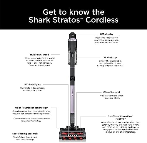 The new Shark Cordless Stratos IZ862H features Clean Sense IQ to detect dirt you can’t see, and automatically boosts power. Stratos has the most powerful suction of any Shark cordless, plus Odor Neutralizer Technology for a fresh-smelling home. Lightweight and easy to maneuver, the DuoClean PowerFins HairPro nozzle delivers the best hair pickup of any Shark cordless stick vacuum.